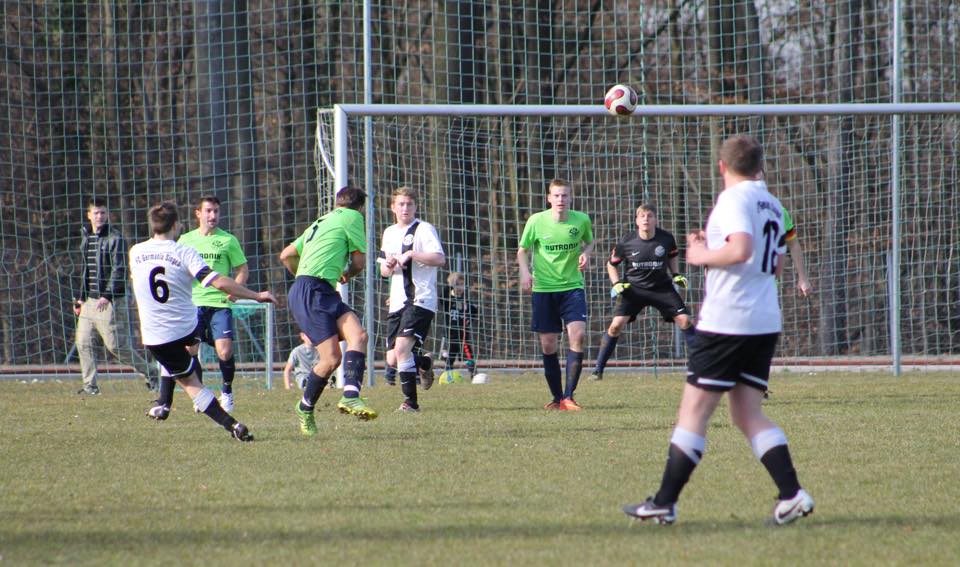 Doch mehr wie zwei kleine Chancen sprangen dabei auch nicht heraus . Dann aus dem Nichts das 1 : 0 in der 21. Minute durch einen Eisinger in unseren Reihen. B.Grimm erzielte die glückliche Führing. Wollte er flanken oder aufs Tor schiessen ? So genau konnte man es nicht erkennen , auf jeden fall senkte sich der Ball zum Entsetzen der Eisinger rechts oben ins Dreieck . Doch wer dachte, dies würde unseren Jungs Auftrieb geben sah sich getäuscht. Wütende Angriffe der Eisinger folgten und die Germanen bettelten um den Ausgleich. Doch mit ein bisschen Glück überstand man die Drangperiode bis zur Halbzeit.