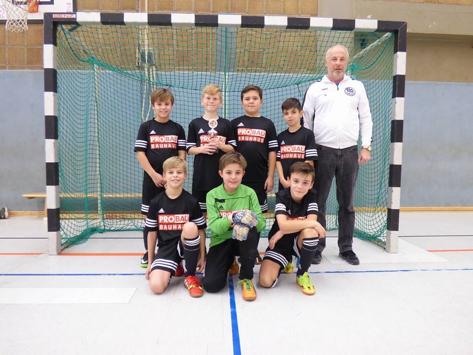 Aufregende Spiele mit blutdruckerhöhenden Spielszenen gab es dann am Sonntag in der Straubenhardthalle zu sehen. Noch vor dem Frühstück ging schon kurz vor 9 h los.Die vermutete Morgenmüdigkeit war erstaunlicherweise den Jungs (und dem Mädel) nicht anzusehen und die ersten zwei Spiele wurden, wenn auch nur knapp, gleich mal gewonnen.Ein nachfolgendes Unentschieden und eine Niederlage gegen den späteren Finalisten, bedeutete auch hier den Einzug ins „kleine Finale“. Wie schon Tags zuvor gab es auch hier, nach packenden 10 Minuten, in der regulären Spielzeit keinen Sieger und so mußten wir erneut in dieses verfluchte Neunmeterschießen.Wie am Vortag waren abermals die Gegner etwas zielsicherer und am Ende stand auch hier dann ein sehr guter 4 Platz zu Buche. Es spielten : Dalina, Robin, Thorben, Leon, Finn, Rick und Dzenan