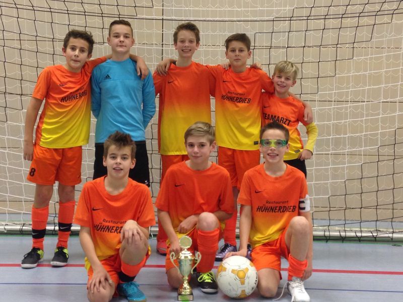 Am 13.2. stand unser vorletztes Hallenturnier an. Im Modus „Jeder gegen Jeden“ mussten unsere Jungs zuerst gegen die deutlich unterlegene SG Enztal 3 antreten. Nach dem 5:1 Sieg warteten alle gespannt auf das Derby gegen die SG Remchingen. Gewohnt schwer tat sich unsere Mannschaft und konnte eine knappe 1:0 Führung über die Zeit retten. Ebenso zäh lief das Spiel gegen SG Enztal 2 – das überraschend auch nur mit 1:0 gewonnen werden konnte. Nach dem 3:1 Sieg gegen 1.FC Birkenfeld ging es zuletzt im Spitzenspiel gegen SG Enztal 1 um den Turniersieg. Aufgrund des Torverhältnisses war klar, dass ein Unentschieden nicht ausreichen würde – ein Sieg musste her. Doch anstatt aggressiv nach vorn zu gehen, ließen sich die Jungs ausspielen und lagen 3 Minuten vor Schuss 0:2 im Rückstand. Auf den Zuschauerrängen hatte man sich bereits vom Turniersieg verabschiedet, doch dann ging alles Schlag auf Schlag. Nach einem Anschlusstreffer witterten unsere Jungs wohl doch noch eine Chance und schafften nur eine Minute vor Schluss den Ausgleich. Nach dem Anstoß erkämpften sich die jungen Bären direkt wieder den Ball und tatsächlich zappelte der Ball nur Sekunden vor dem Schlusspfiff erneut im gegnerischen Netz. Dieser 3:2 Sieg bedeutete gleichzeitig den Turniersieg. Glückwunsch Jungs, im richtigen Moment Gas gegeben , das Spiel trotz Rückstand noch gedreht und den Pokal verdient in Empfang genommen, wenn es im Fanblock auch wieder beinahe zu Nervenzusammenbrüchen und Atemnot gekommen ist.