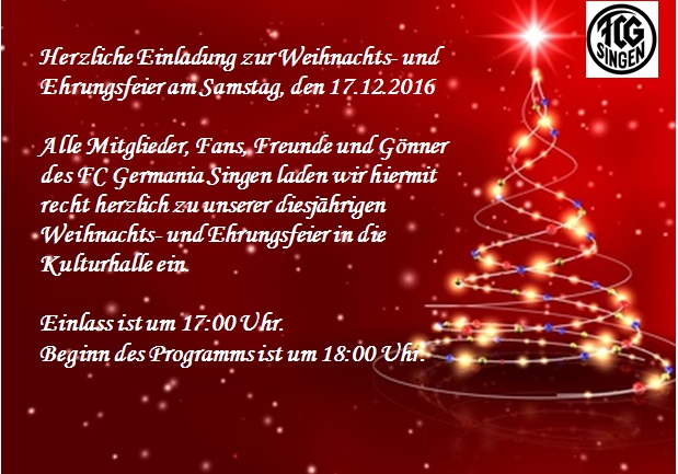 Zum Jahresabschluss laden wir unsere Mitglieder, Fans, Freunde und Gönner herzlich zur Weihnachts- und Ehrungsfeier in die Kulturhalle Remchingen ein.